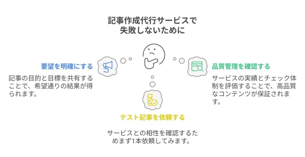 例)「ブログ初心者で、記事作成代行を初めて検討している方」をターゲットに設定すると、難しい用語を避け、依頼時のチェックリストやお得な活用法を重点的に紹介するのが有効です。