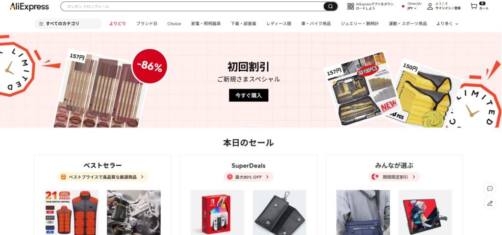 また、AliExpressは日本語表示にも対応しており、クレジットカード決済や各種オンライン決済が利用できるため、中国輸入初心者でも比較的ハードルが低い仕入れ先といえます。セールやクーポンも頻繁に実施されており、タイミング次第では大幅なコストダウンも可能です。さらに、実際の購入者レビューを確認できるため、品質リスクの見極めもしやすくなっています。